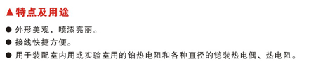電線管與接線盒連接,線管里面的電線在接線盒中連起來,起到保護(hù)電線和連接電線的作用。熱電偶和熱電阻接線盒是用來固定接線座和作為連接器的裝置,它起著保護(hù)感溫元件免受外界氣氛侵蝕和使外接導(dǎo)線與接線柱接觸良好的作用,根據(jù)被測(cè)量溫度對(duì)象和現(xiàn)場(chǎng)環(huán)境條件及要求,除了普通型接線盒外,還有防濺型、防水型、防爆型、接插型、不銹鋼、塑料和一體化溫度變送器等接線盒。我們?nèi)绻麑⒏鞣N類型的接線盒裝配成熱電偶和熱電阻產(chǎn)品,則這些產(chǎn)品相應(yīng)即為防濺型、防水型和接插型等熱電偶和熱電阻了。
