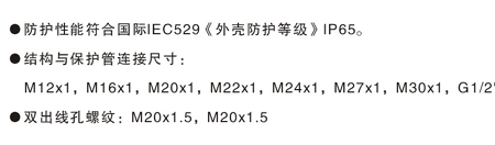 結構與保護管連接尺寸:M12x1,M16x1,M20x1,M22x1,M24X1,M27X1,M30X1,G1/2"