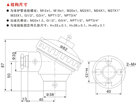 與接線板固定兩孔距尺寸: H =33±0.1,H =36±0.1,H=40±0.1