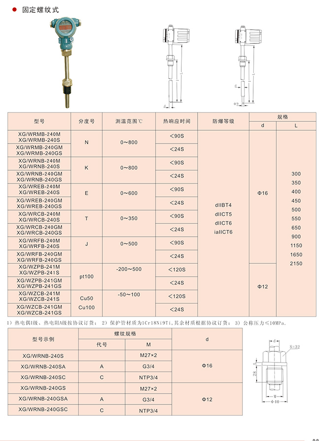 固定螺紋式,現場顯示一體化熱電偶(阻)一種新型結構的測溫儀表,現場LCD或LED數字顯示,溫度變送器二線4~20mA.DC信號輸出,感溫元件可采用鎧裝壓簧式抗震結構,感溫元件與上保護管采用圓筒隔爆結構,具有可抽芯的特點。固定螺紋式現場顯示一體化熱電偶(阻),適用于石油、化工、輕工、電力等行業,空氣、蒸汽、薄霧等介質中含有碳氫化合物等爆炸性混合物及腐蝕性的場所,測量范圍-200~1000℃,現場顯示特別適用于無法用雙金屬溫度計等測量的高溫介質中。