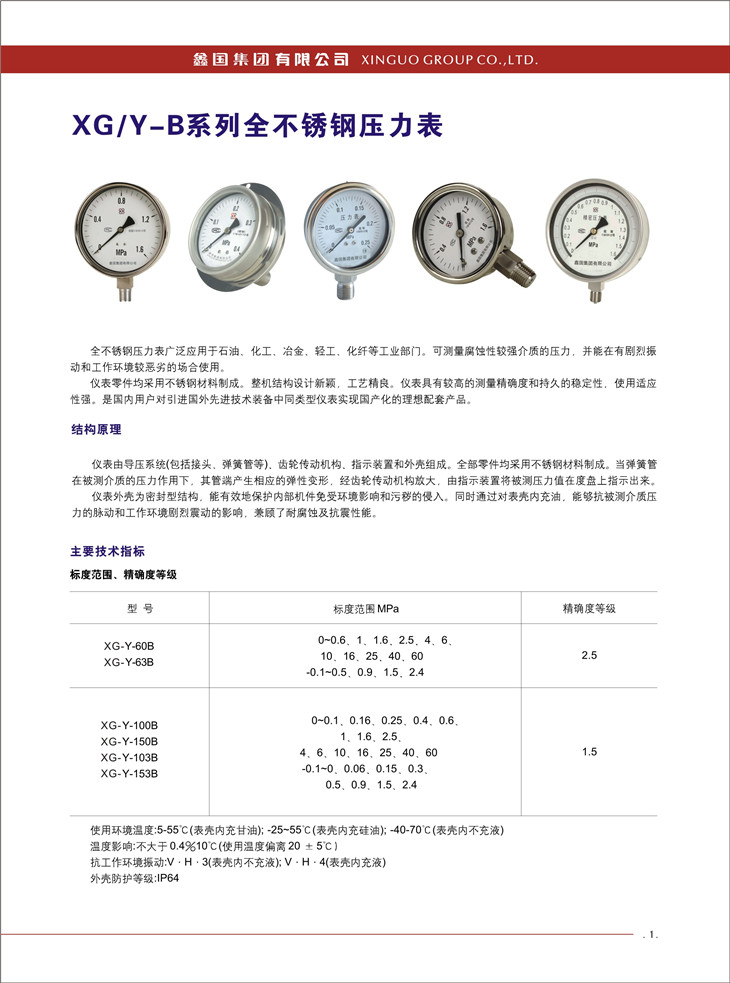 全不銹鋼壓力表零件均采用不銹鋼材料制成。整機結構設計新穎,エ藝精良。儀表具有較高的測量精 確度和持久的穩定性,使用適應性強,是國內用戶對引進國外先進技術裝備中同類型儀表實現國產化的理想配套產品。
