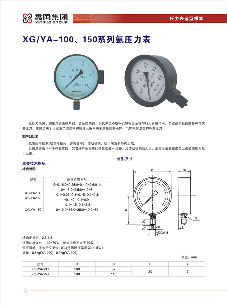 XG-YA-100/150系列氨壓力表,氨壓力表用于測(cè)量對(duì)普通碳系鋼,合金結(jié)構(gòu)鋼,奧氏體類(lèi)不銹鋼及錫鉛合金釬焊料無(wú)腐蝕作用,非結(jié)晶和凝固的各種介質(zhì)的壓力。氨壓力表主要適用于化肥生產(chǎn)過(guò)程中和制冷設(shè)備中