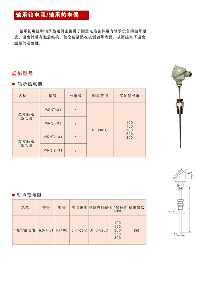 軸承鉑電阻和軸承熱電偶主要用于測量電站各種帶有軸承設備的軸承溫度,溫度計帶有避震結構,使之能緊貼在被測軸承表面,從而提高了溫度測量的準確性。